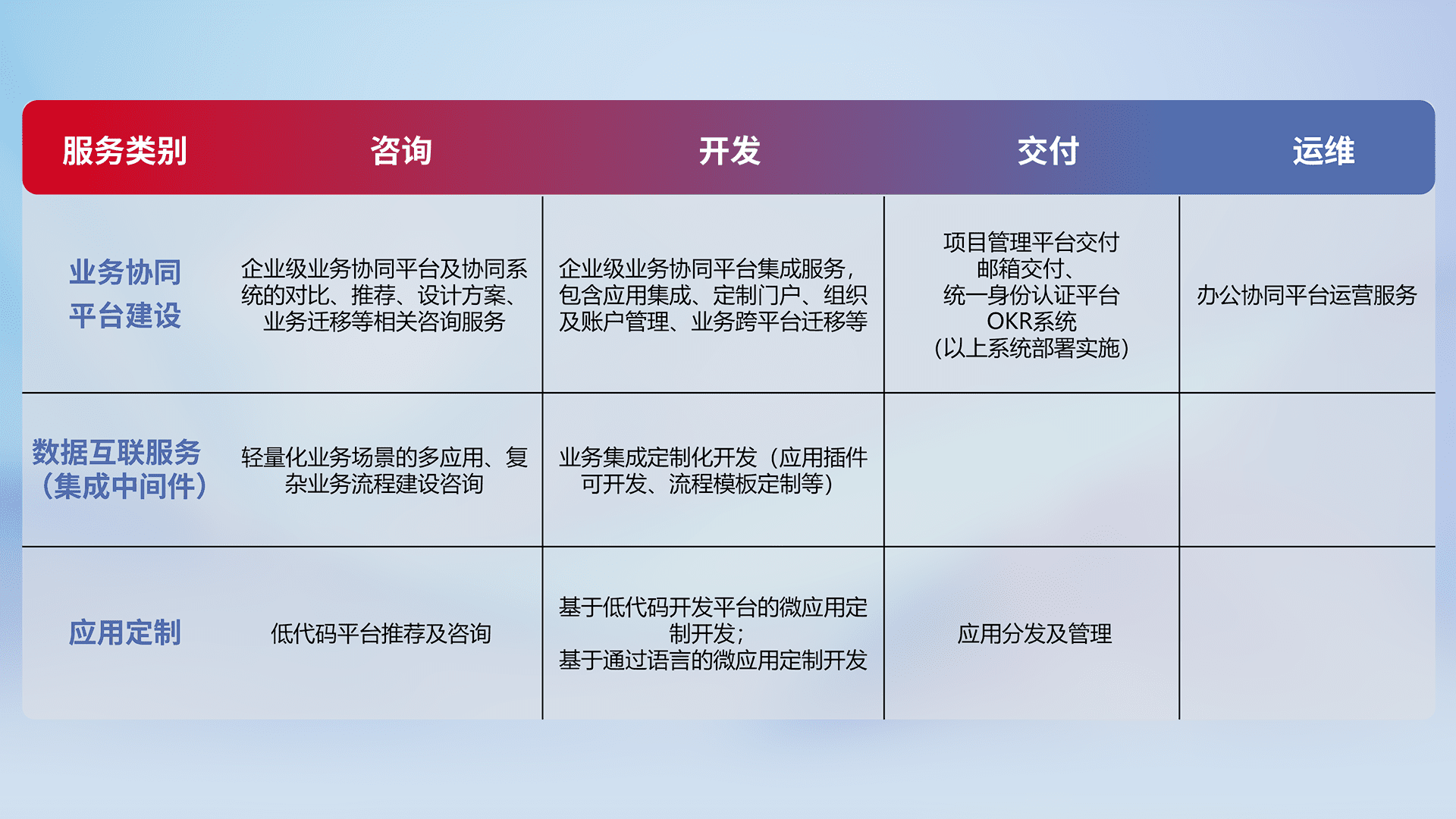 针对钉钉、、企微、、、、IDaas等平台级产品提供产品的规划、、方案、、交付、、定制化开发等服务,,实现如统一协同办公、、、智能客户服务、、、混合会议管理、、、智能数据查询、、、等业务场景,,,实现数字化转型。。。